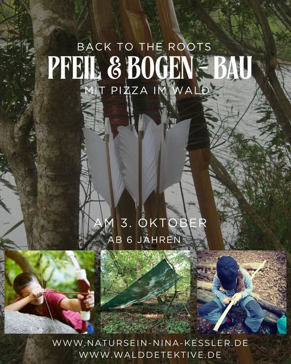 Du wolltest schon immer mal deinen eigenen Bogen bauen? Adrian, Naturmensch und Tüftler, der einfach ALLES basteln & bauen kann - und ich - bereiten im Vorfeld Haseläste so weit vor, sodass du diese (natürlich mit Hilfe, falls nötig) schnitzen und feilen kannst, kreativ gestalten darfst und mit uns gemeinsam den Bogen dann spannen kannst. Sind alle Bögen fertig gestellt und Pfeile geschnitzt, dürfen diese auch noch ausprobiert werden und natürlich mit nach Hause genommen werden. BACK TO THE ROOTS - mit einfachen Mitteln schauen wir, wie wir Pfeil und Bogen anfertigen können - fast so, wie es unsere Vorfahren gemacht haben. Auch hast du die Möglichkeit, kleine Figuren aus Lehm zu gestalten. Eine Kunstform, die auch schon unsere Ahnen kannten. Mit Naturfarben kannst du deinen Bogen noch einfärben und diesem eine ganz spezielle Note geben! BACK TO THE ROOTS - wird ein Nachmittag voller Werkeln, Erlernen neuer Fertigkeiten, Eintauchen in ursprüngliche Herstellungsverfahren und voller glücklicher Momente sein! Du wirst entdecken, was Alles in dir steckt und wie wunderbar es ist, am Ende einen fertigen, selbst hergestellten, Bogen in den Händen zu halten! Wir freuen uns schon auf dich! Und... natürlich ist das gemeinsame Essen von köstlicher Pizza ein weiteres Highlight!