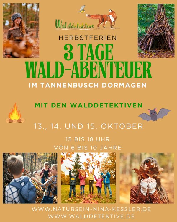 Das bunte Herbstferienabenteuer lädt dazu ein, die warmen Farben und die letzten Sonnenstrahlen zu genießen! Drei Nachmittage verbringen wir auf unserem abwechslungsreichen Waldplatz im Tannenbusch, der unendlich viele Möglichkeiten bietet und die Kreativität der Kinder fördert. Naturverbundenheit und Miteinander prägen das bunte Herbstprogramm: Wir stellen Kreatives aus herbstlichen Naturmaterialien her, bereiten einen Waldsnack zu, spielen Waldmemory o.ä., legen ein Abenteuer-Camp an - und am letzten Tag begeben wir uns auf eine kleine 'Nacht'-Wanderung (in der Dämmerung, am 15. Oktober treffen wir uns ein bisschen später). Mit Taschenlampen ausgerüstet erleben wir den Herbstwald noch einmal von einer ganz anderen Seite: Welche Geräusche begegnen uns hier, was können wir entdecken? Aufregende Tage erwarten uns im Oktober - wir können ein Blätterbad nehmen, Waldschätze sammeln und auch Geschenke für die Tiere hinterlassen!